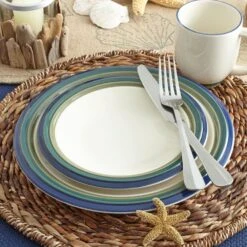 Crafted of Stoneware, featuring a reactive glaze. Due to the nature and hand-crafted qualities of reactive glaze, no two pieces are exactly alike and will exhibit unique variations in color and pattern. Product may slightly differ from image shown. Each service includes: 10-1/2 inch diameter blue dinner plate, 8-1/2 inch diameter stalks salad plate, 6 inch diameter (24 ounce) blue cereal bowl, and 13 ounce blue inch mug. Microwave and dishwasher safe.