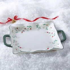 Each piece from the Dancing Snowflakes Collection has a distinct look, from a bold red band with a green garland frame, to white pieces bordered by a green garland and centered by a red leaping deer design. Crafted of porcelain. Each service includes: 10-1/2 inch dinner plate, 8 inch salad plate, 5-1/2 inch diameter (26 ounce) soup cereal bowl and 13 ounce mug. Microwave and dishwasher safe.