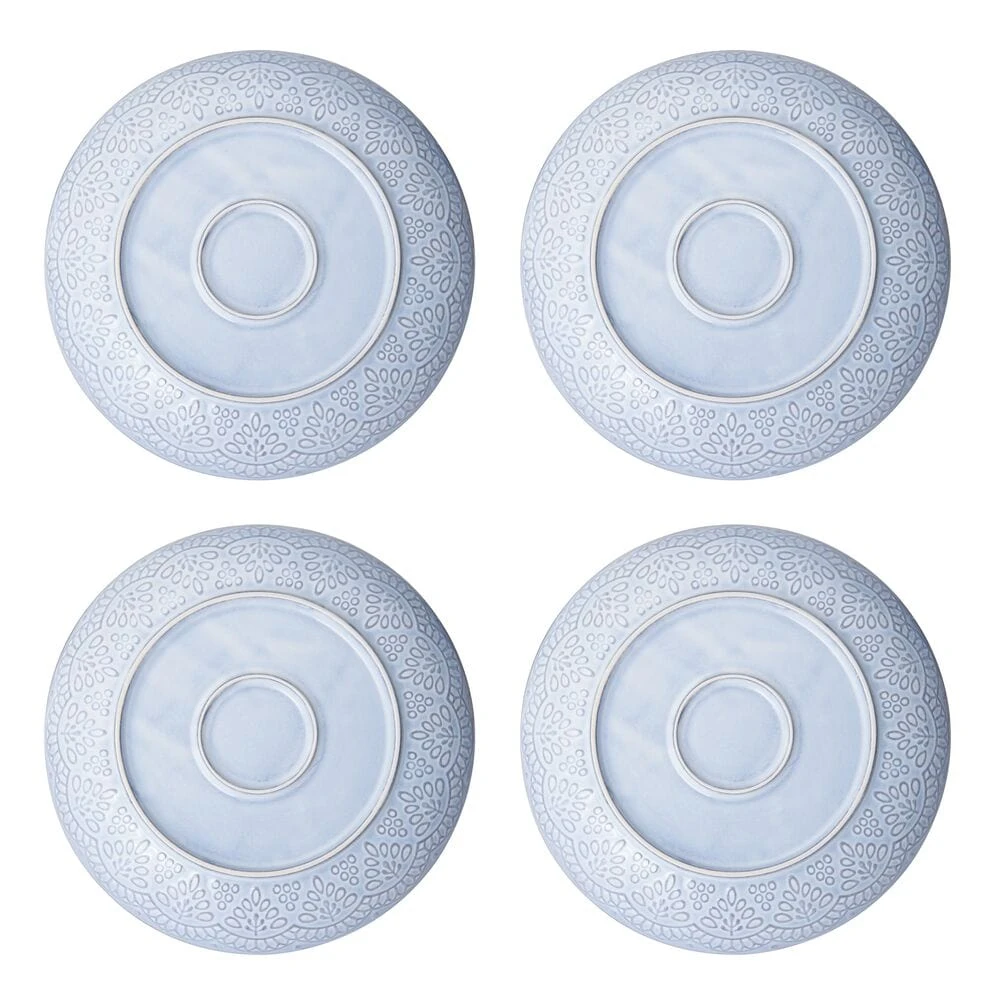 Gabriela Gray features a light gray floral motif with scalloped embossing on a light blue exterior, bringing a classic style to everyday dining. Crafted of Stoneware, featuring a reactive glaze. Due to the nature and hand-crafted qualities of reactive glaze, no two pieces are exactly alike and will exhibit unique variations in color and pattern. Product may slightly differ from image shown. 16 piece dinnerware set, service for four, includes (4) each: 10-1/2 inch dinner plate, 6 inch (26 ounce) soup cereal bowl, 8 inch (36 ounce) pasta bowl and 14 ounce mug. Microwave and dishwasher safe.