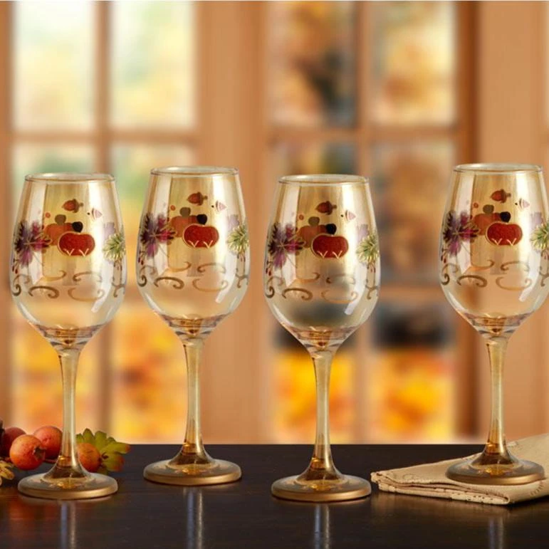 From a chilled chardonnay to a robust merlot, your favorite wine always tastes better sipped from a glass decorated to match your favorite Pfaltzgraff dinnerware pattern. Plus, the autumn colored leaves, pumpkins and gold accents will add a warm touch of fall to your dining table. Each glass has a hand-painted design and may vary slightly in color and pattern. Hand wash only. Set of 4 leaf luster wine glasses, each 8-1/2 inches high and holds 10 ounces.