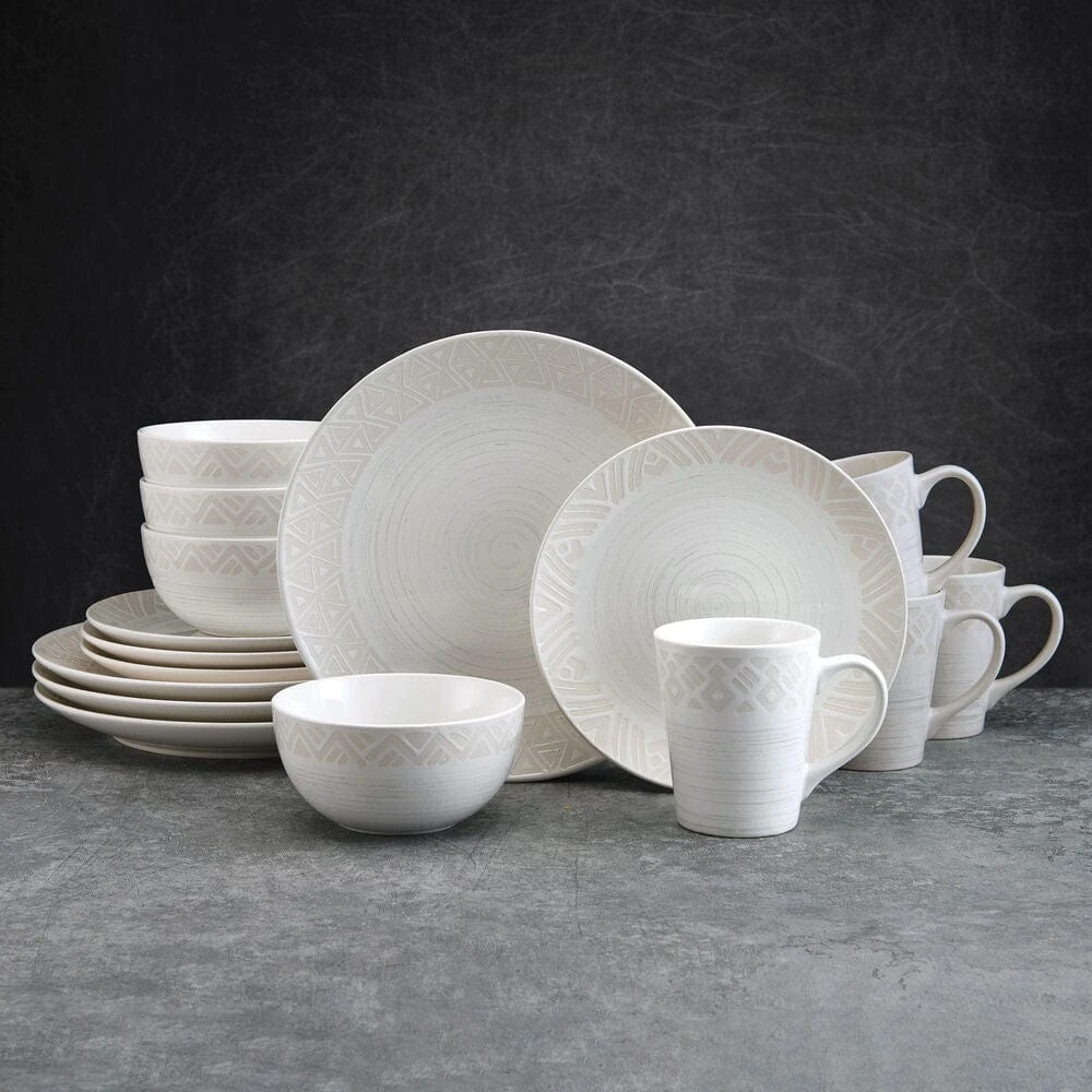 This Pfaltzgraff Vera Dinnerware Set features a cream color background, with a rustic spiraling design, bordered by a thick band adorned with an eye-catching geometric pattern, bringing contemporary style to your table.