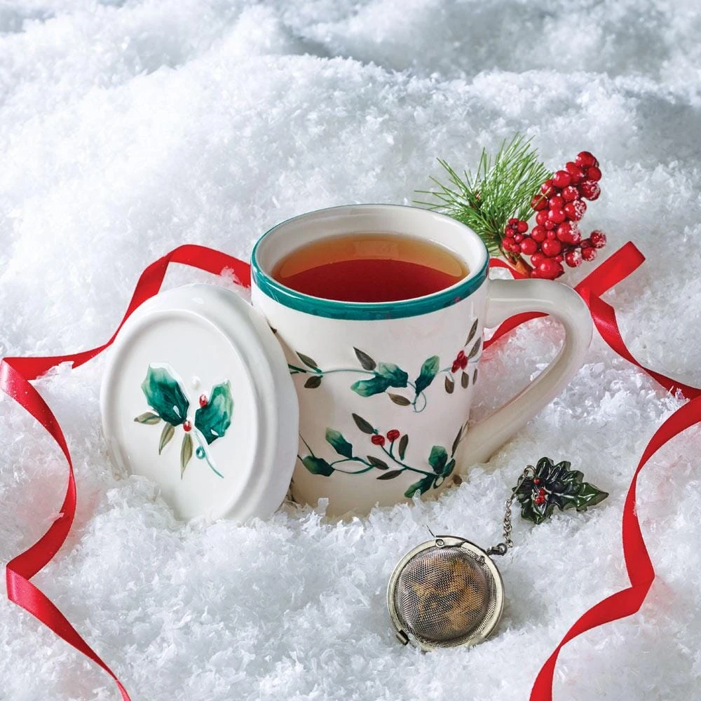 A thoughtful gift for the tea lover. Includes a stainless steel infuser with de tailed weight for loose-leaf tea. The lid holds in steam to steep a perfect cup every time. Comes in a gift box. Constructed of stoneware. Microwave and dishwasher safe. Mug measures 4- 1/2 inch high and holds 12 ounces.